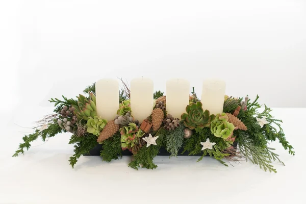 Längliches Adventgesteck mit 4 weißen Kerzen