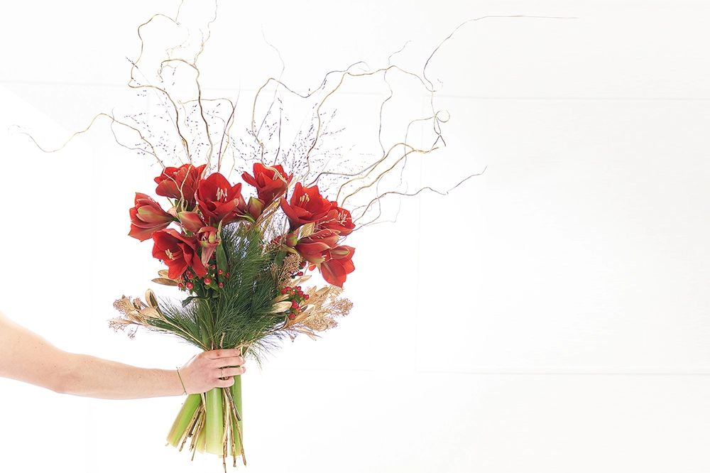 Es Weihnachtet: is a red Christmas bouquet with amaryllis, golden branches and coniferous twigs - festive and elegant.