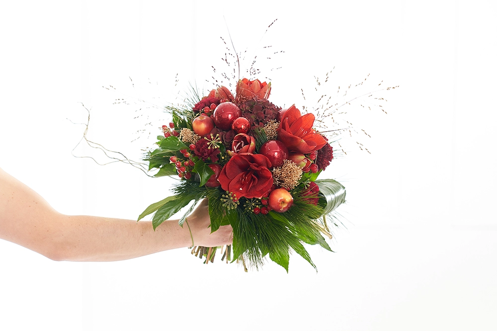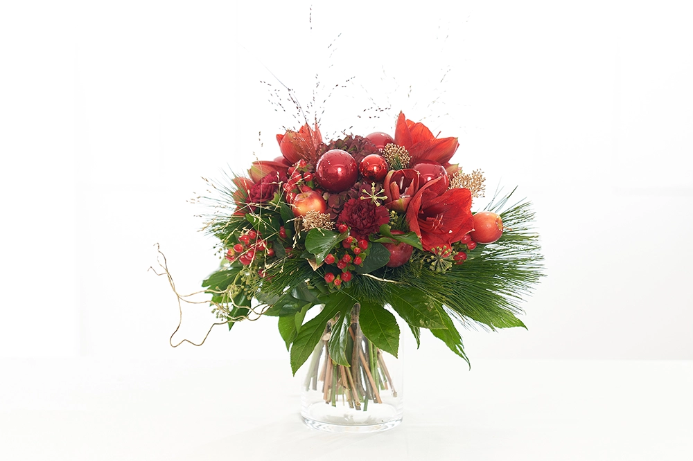 Weihnachtsgeschenk: ist ein roter Weihnachtsstrauß mit Amaryllis, Chrysanthemen, Hortensien und Weihnachtskugeln - Festlich und elegant.
