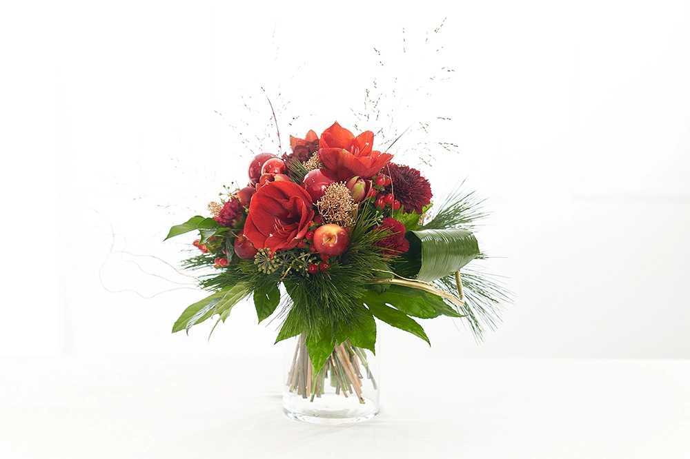 Bringen Sie weihnachtliche Eleganz in Ihr Zuhause mit unserem handgefertigten Strauß in leuchtendem Rot, liebevoll arrangiert mit Amaryllis, Chrysanthemen, Hortensien und dekorativen Weihnachtskugeln. Der Strauß vereint klassische Weihnachtsfarben mit festlichem Grün und glänzenden Akzenten und sorgt für eine stilvolle, besinnliche Atmosphäre.